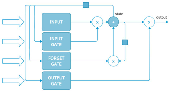 The essence of LSTM is feedback loops existing between the basic network units, which are the memory cells. Another distinguishing feature of LSTM is that it has specific logic gates: an input gate, a forget gate, and an output gate. The input data is calculated by regular artificial neuron units. The accumulation of their values to a state is governed by an input gate, which learns to protect the error flow present in the memory cells against interference from irrelevant input data [55]. The steady, non-decaying, and non-increasing error flow is managed by a feedback loop and the forget gate, which controls the maintenance of the stability of the weight. The output gate opens and closes access to the steady error flow, learning to protect other memory cells against interference from their currently irrelevant contents. A diagram of information processing in LSTM [56] is shown in Figure 1.