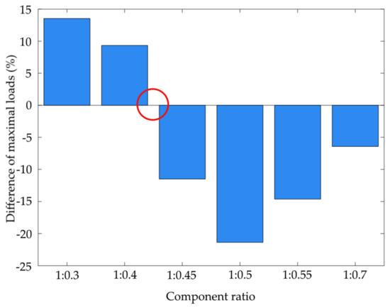 The recorded experimental test data was analysed with two approaches: first, a set of averaged data was tested, and second, the processing was run on the samples at random within the assumed range of adhesive composition mix ratios. The common core of both approaches is the generic diagram of signal processing, consisting of the determination of the zero crossings for the differential maximum breaking force vs. the selection of component mix ratios (Figure 5). The columns show the values of the differences of the maximum destructive loads between the heated and non-heated joints, expressed as a percentage increase/decrease in relation to the non-heated joint load. The red circle marks the assumed area of the sought component ratio. Generally speaking, the test data, which included a specific mix ratio of the applied adhesive components, was analysed by forecasting the full-strength characteristics. The input data was the strength characteristics for the mix ratios at which the static strength was found to be reduced after heat-held curing. The sequence of input data was set from the highest to the lowest hardener ratio: 1:0.7; 1:0.55; 1:0.5; 1:0.45; 1:0.4; and 1:0.3.