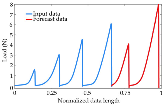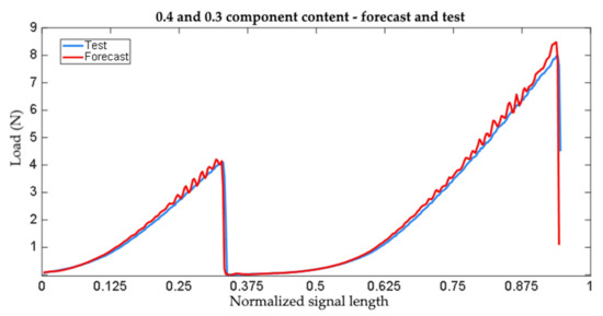 The signal processing diagram for the first approach involved preprocessing by resampling and averaging the data. The trends within the specified mix ratios were forecast. The declared teaching data was the averaged trends with the hardener ratio order from the highest to the lowest. Here, the ratios were 1:0.7; 1:0.55; 1:0.5; and 1:0.45, equal to 67% of the entire signal length (Figure 6). The remainder of the signal which included two full-strength characteristics (for mix ratios 1:0.4 and 1:03) were forecast with a DLN LSTM algorithm (Deep Learning Networks—Long Short-Term Memory). For the downstream data processing, the experimental test data was also included for mix ratios 1:0.4 and 1:0.3 (independent of the forecast). Based on the produced test results, the maximum breaking forces, namely Lmax, were determined for the heat-held cured joints (LmaxH) and the ambient temperature-cured joints (LmaxN). Based on the breaking force determined for the values obtained by experimental testing (LmaxT) and the values from the forecast characteristics (LmaxF), the following differences were determined: