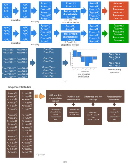The second dataset was random samples in the following range: test temperature, mix ratios, and curing specifications. Similar to the first analysis, the input (teaching) data for the forecast was the trends with the decreasing mix ratios: 1:0.7; 1:0.55; 1:0.5; and 1:0.45. The output was the forecasts of subsequent trends for mix ratios 1:0.4 and 1:0.3. Each resulting trend had the maximum breaking force of the specimen determined separately for the forecasts and the experimental tests. The produced breaking force values for all tested mix ratios were adopted as the nodes for the subsequently interpolated functions. In line with the objective of this paper, each set of specimens had zero crossings determined, denoting the proportions of the components at which holding at heat was no longer relevant to the adhesive joint strength. The processing diagram of the algorithm for independent tests is shown in Figure 7b.