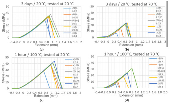 Stress–extension graphs of tested adhesive joints prepared under inaccurate addition of hardener component in adhesive (random samples): (a) cured 3 days at 20 °C, tested at 20 °C; (b) cured 1 h at 100 °C, tested at 20 °C; (c) cured 3 days at 20 °C, tested at 70 °C; and (d) cured 1 h at 100 °C, tested at 70 °C.