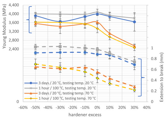 Mean Young’s modulus and mean extension-to-break of tested adhesive joints prepared under inaccurate addition of hardener component in adhesive.