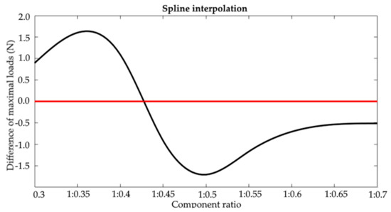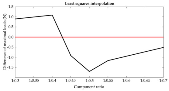 Based on the characteristics produced, differences in the maximum breaking forces were determined between the heat-held cured joints and the ambient temperature-cured joints. The result was the node points with the coordinates which denoted the values of the differences between the maximum breaking forces. The zero crossings were determined by interpolation. This process was applied separately for the values from the experimental tests and the forecasts. Examples of the interpolation results are shown in Figure 15 (least-squares method) and Figure 16 (cubic spline). The full summary of the produced values is shown in Table 5.