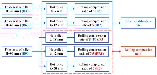 The solidification rates decreased with the increase in billet thickness, which affected the microstructure and TiC particles formed in the TiC-reinforced steels. The TiC-reinforced steels were homogenized at 1200 °C for 3 h and then hot rolled by two-stage controlled rolling [30] with two reverse rolling mills and cooled by air to ambient temperature. The 30 mm-thick, 60 mm-thick, and 90 mm-thick billets (sample ID: B30, B60, B90) were hot rolled with a rolling compression ratio of 5 (sample ID: B6, B12, B18) to study the effects of the billet solidification rate on the particles and wear resistance of the TiC-reinforced steels. Three 90 mm-thick billets were hot rolled under different rolling compression ratios of 7.5, 5, and 3 (sample ID: R7.5, R5, R3) to study the effects of the rolling compression ratio on the particles and wear resistance of the TiC-reinforced steels, and the sample ID and the corresponding processing routes are summarized in Figure 1. The TiC-reinforced steels after hot rolling were heated to 900 °C to austenization in a box-type resistance furnace and followed by water quenching to room temperature; then, they were tempered at 200 °C.