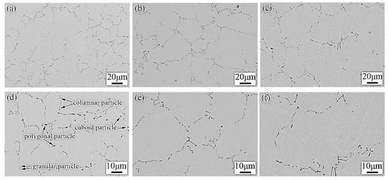 Morphologies of particles in the billets with different thicknesses: (a,d) B30; (b,e) B60; (c,f) B90.