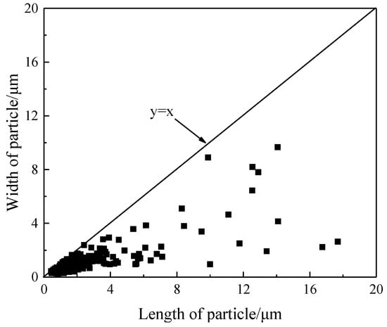 Scatter diagram of particles’ length and width in the billet with thickness of 30 mm.