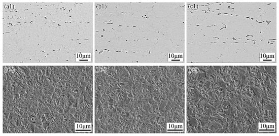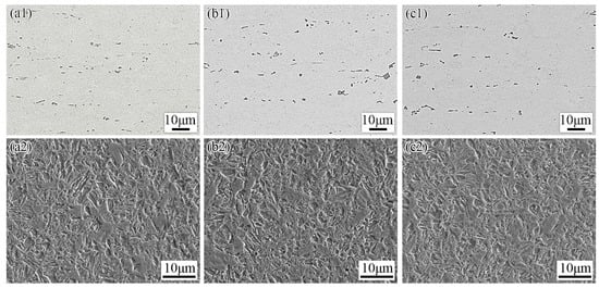Morphologies of particles (a1–c1) and microstructure (a2–c2) in heat-treated TiC-reinforced steels with different billet thickness: (a) B6; (b) B12; (c) B18.