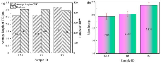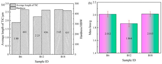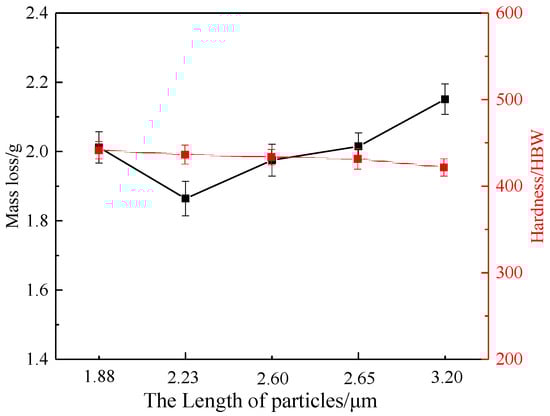 Based on the above analysis, the volume fraction of TiC was similar in all TiC-reinforced steels. The change trend of the average aspect ratio of TiC was consistent with the average length of particles, but the average aspect ratio changed slightly. Thus, the average length of particles and hardness were the main influencing factors in wear resistance. To discuss the factors that affect the wear resistance, the relationship between the average length of particles, hardness, and mass loss of heat-treated TiC-reinforced steels is shown in Figure 10. The wear resistance first increased and then decreased with the hardness decreasing, which was inconsistent with most of the research results. The wear resistance of the TiC-reinforced steel with 436 HBW was 1.15 times that of the TiC-reinforced steel with 421 HBW. However, in our previous study [37], the wear resistance of the TiC-reinforced steel with 436 HBW was 1.05 times that of the TiC-reinforced steel with 421 HBW when the size of particles is similar, so the particle size played an important role in wear resistance.