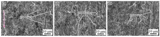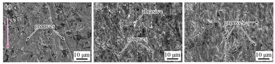 The wear morphology of TiC-reinforced steels was conducted using SEM (Figure 6), which reveals that the micro-cutting, furrow, and strain fatigue effects were the main wear mechanisms. More grooves that were caused by the micro-cutting mechanism can be found in the wear morphology of the heat-treated B6 steel (Figure 6a). The materials’ removal requires only one pass of groove caused by the micro-cutting mechanism, which causes more serious mass loss; thus, the wear resistance of the heat-treated B6 steel was poor. The worn surface features more furrow wear mechanism characteristics of the heat-treated B12 steel (Figure 6b); meanwhile, the abrasive tip was also broken and embedded in the matrix, which prevented the grooves from extending and reduced the mass loss of the materials. The worn surface shows more micro-cutting mechanism wear characteristics of the heat-treated B18 steel (Figure 6c). These results explain the relatively good wear resistance of the heat-treated B12 steel.
