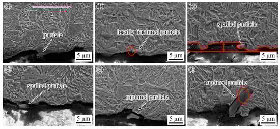 To analysis the influence of the particle size on wear, the micrographs of longitudinal sections of the TiC-reinforced steels were performed by SEM. The longitudinal section sample was obtained by electro-discharge machining from the wear sample along the wear direction, and the particle states on the wear area were observed. As indicated in Figure 11, the particles standing out on the worn surface have different states including locally fractured particles, ruptured particles, and spalled particles. Figure 11 confirms that the depth of the groove (the distance of the two red lines in Figure 11c) becomes shallow when the abrasive tip glides through the particle, because the particles’ hardness (2859–3200 HV) is larger than the abrasive’s hardness (1100~1300 HV); thus, the particles can reduce the damage of the abrasive to the specimen.