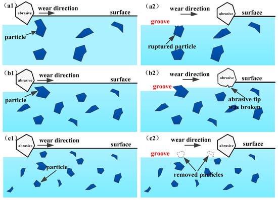 A schematic drawing (Figure 12) illustrates the effect of particle size on the wear mechanism. The large particles will be broken easily by the abrasive (Figure 12a), so large particles cannot effectively prevent the damage of the abrasive to the matrix, and the wear resistance decreases. The hardness of the particle is much larger than that of the abrasive, so the moderately sized (2–6 μm) particles can break the abrasive tip and prevent the groove from extending, as shown in Figure 6b and Figure 12b. The small particles are removed by the abrasive in the wear process, as shown in Figure 12c. The fine particles cannot play a role in preventing the abrasive from sliding, which has less of an effect on improving the wear resistance.