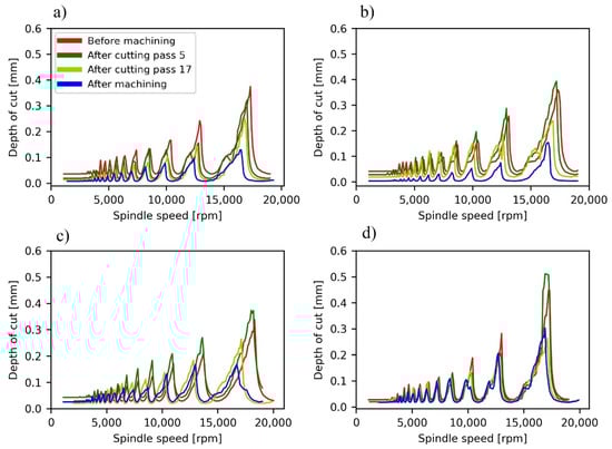 - Given the current experimental setup, higher axial depths of cut (even 50% of the thickness of the sample) lead to a more stable machining than lower ones. It happens because higher depths of cut also entail higher lead edge angles, which avoid chatter. In addition to a more stable machining, higher depths of cut also lead to a more productive machining and to a surface roughness that complies with industry quality requirements.