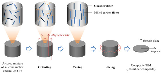 It is generally accepted that filler alignment is an effective approach to remarkably improve the thermal conductivity of composites in a specific direction [4,6], which is useful and well suited to the requirements of TIMs. The control over filler alignment has been used to make the most of the advantages of the anisotropic properties of low-dimensional materials. In terms of thermal properties, the axial thermal conductivity of one-dimensional fillers and the in-plane thermal conductivity of two-dimensional fillers are usually much higher than those in the perpendicular direction. Based on this, some research efforts have been directed towards the alignment of alumina platelet [7,8], boron nitride [9,10,11], carbon nanotube [12,13,14,15], carbon fiber (CF) [5,16,17], graphene [18,19,20,21] and some other fillers. Among these fillers, CF has greater potential due to its higher axial thermal conductivity (up to 1000 W/(m·K)) compared to ceramic fillers (alumina platelet, boron nitride), and its more appropriate size than nanofillers (carbon nanotube, graphene), which have more filler/polymer interface, resulting in phonon scattering. In some of the previous studies, the CFs were long enough to penetrate through the material, which significantly improved the thermal performance of TIMs [5]. However, when these penetrating CFs are compressed, they have no room to move downward, making it difficult for the TIM to deform in the thickness direction. Conversely, the discontinuous structure composed of shorter fibers allows TIM to take advantage of the high elasticity of the matrix to produce greater deformation and lower hardness. Therefore, milled CF is a more suitable filler for TIM.