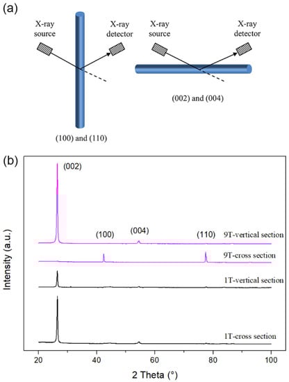 XRD analysis of CF–rubber composites. (a) Illustration of alignment effect of CFs on XRD patterns; (b) XRD patterns of 1 T and 9 T samples in vertical-section and cross-section.