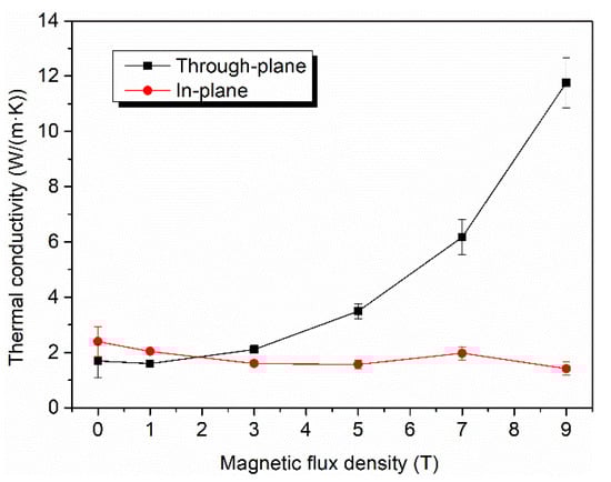 The through-plane and in-plane thermal conductivity of the CF–rubber composites as a function of magnetic flux density.