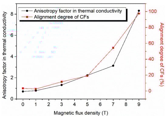 The thermal conductivity of the CFs used in this study has obvious anisotropy. The axial thermal conductivity of these CFs is as much as 900 W/(m·K), but the radial thermal conductivity is only around 5 W/(m·K), with a difference of up to 180 times. Therefore, the alignment of CFs is crucial to the thermal properties of the composites. The thermal conductivity of the CF–rubber composites in both the through-plane and in-plane directions is shown in Figure 6 as a function of magnetic flux density. The thermal conductivity of composite without applying magnetic field (0 T) was also measured for comparison. It is apparent that the composites acquired enhanced thermal conductivity in the through-plane direction with increased magnetic flux density. With the increase in magnetic flux density from 0 T to 9 T, the thermal conductivity in the through-plane direction increased nearly 6-fold, rising from 1.69 W/(m·K) to 11.76 W/(m·K). In contrast, the thermal conductivity in the in-plane direction followed a downward trend. Such tendencies could account for the rotation of CFs in the magnetic field. According to the foregoing SEM images and XRD patterns, when the applied magnetic flux density is low, the axis of CFs with higher thermal conductivity tends to array along the in-plane direction, and thus the in-plane thermal conductivity is higher than the through-plane thermal conductivity, as can be seen from the data points of the 0 T and 1 T samples in Figure 6. When the applied magnetic flux density is higher, the CFs start to overcome the restriction of gravity and align along the direction of the magnetic field, namely in the through-plane direction. Therefore, the through-plane thermal conductivity increases, and the in-plane thermal conductivity decreases. Since the through-plane alignment is in a single direction rather than along the plane, and the in-plane alignment of the 0 T sample is incomplete, the through-plane thermal conductivity of the 9 T sample is much higher than the in-plane thermal conductivity of the 0 T sample, and the improvement of through-plane thermal conductivity with increasing magnetic flux density is much more remarkable than the decline of in-plane thermal conductivity. These results can be attributed to the thermal conductive chains created by CFs. The heat tends to be transferred through the axis of CFs owing to the anisotropic thermal property of CFs and so the axis of CFs is the key constitution of the thermal conductive chains. As illustrated in Figure 7, when the CFs are aligned along the in-plane direction, thermal conductive chains also tend to align along this direction. On the contrary, when the CFs are aligned along the through-plane direction, not only does the length of the thermal conductive chains in the through-plane direction decrease visibly, the thermal conductive chains created by the same number of CFs are also more numerous. Hence, the magnetic alignment of CFs confers a much better thermal transfer performance along the CF alignment direction. To trace the correlation between the anisotropy in the thermal conductivity of the CF–rubber composites and the alignment of the CFs, their trends with the variation of magnetic flux density are shown in Figure 8. It is observed that the thermal anisotropy factor (the thermal conductivity in through-plane direction is divided by that in in-plane direction) has a positive correlation with the alignment degrees of the CFs. With the change in magnetic flux density, they display almost the same trend, which further indicates the relations among the magnetic field, alignment, and thermal properties.