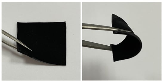 Hardness is an important mechanical property of TIMs. As shown visually in Figure 9, the CF–rubber composites are pliable and very easy to bend and deform. The hardness of the composites is displayed in Figure 10, and is only 60~70 (shore 00). The low hardness benefits from the low filler loading (only 20 vol%) and the discontinuous structure (milled CFs). Furthermore, as a result of the aligned CFs, the composites are capable of efficient heat conduction. Thus, it has great potential as TIMs to fill the gaps between the contact surfaces and enhance the heat transfer at the interface simultaneously. The magnetic flux density has a slight effect on the hardness of the CF–rubber composites, which can be attributed to the magnetic alignment and the anisotropic mechanical property of CFs. This is consistent with the previous study on the Young’s modulus of anisotropic polymer composites [39].
