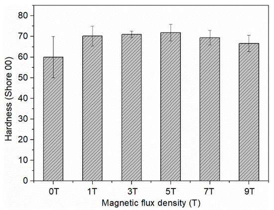The hardness (shore 00) of the CF–rubber composites applied with different magnetic flux density.