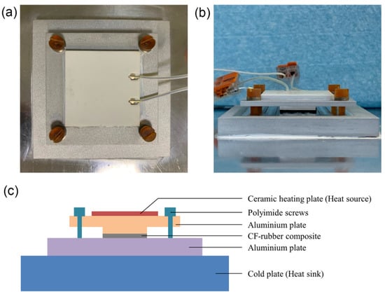 Scanning electron microscopy (SEM, Quanta FEG 250, FEI, Hillsboro, OR, USA) was used to characterize the micro-morphology of CF–rubber composites at an accelerating voltage of 10 kV. To achieve better imaging quality, samples were sputter coated with a thin layer of gold before visualization. To evaluate the alignment degree of milled CFs in polymer matrix, X-ray diffraction (XRD) analysis of CF–rubber composites was carried out with a Rigaku SmartLab X-ray diffractometer (Rigaku, Tokyo, Japan) using Cu Kα radiation of 1.54 Å at a generator voltage of 40 kV with reflection mode. The thermal conductivity (λ, W/(m·K)) was calculated as the multiplication of thermal diffusivity (α, mm2/s), density (ρ, g/cm3), and specific heat capacity (Cp, J/(g·K)). The thermal diffusivity (α) of the specimens (with a dimension of Φ12.7 × 1 mm) was measured by the laser flash method using an LFA447 Nanoflash (NETZSCH Instruments, Selb, Germany). The density (ρ) was measured by Archimedes’ principle, and the specific heat capacity (Cp) was measured using differential scanning calorimetry (DSC 214, NETZSCH Instruments, Selb, Germany). The hardness was measured using a hardness tester (Shore 00, Instron, Norwood, MA, USA). The thermal management performance of composites was characterized by an infrared thermal imager (E8xt, FLIR, Wilsonville, OR, USA). In the test, a ceramic heating plate with 7 W power and a cold plate at 15 °C acted as the heat source and heat sink, respectively. The CF–rubber composite was sandwiched between two aluminum plates that were connected with the heating plate and the cold plate, respectively. The composites were tested as TIMs in this test system.