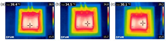 Infrared thermal images of the test system with different CF–rubber composites. (a) Sample—0 T; (b) Sample—5 T; (c) Sample—9 T.