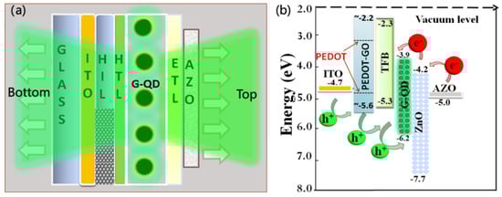 In order to fabricate large-area and low-cost optoelectronic devices, there is an urgent need to develop transparent materials for electrodes with a lower sheet resistance and higher transparency. Recently, for commonly used optoelectronic devices, indium tin oxide (ITO) film can be sputtered at a high temperature of more than 300 °C for limited substrates such as the frequently utilized materials for electrodes. As the electro-optical properties of ITO films can be critically affected by the activation of Sn dopants, it is difficult to fabricate high-quality ITO film without any postprocess, such as heating the substrate or post-annealing [10]. In addition, the high cost of indium (In) as the main component in ITO is a critical problem for ITO electrodes, which limits the large-scale production availability. As a result, it is a requirement to develop alternative, cheap, and transparent materials for electrodes with properties comparable to ITO electrodes. Recently, group III elements, such as Al, Ga, and In-doped ZnO electrodes, have been considered as indium-free and cheaper anode materials for optoelectronic devices, due to the lower price of ZnO materials [11,12]. However, the performance of optoelectronic devices based on Al-doped ZnO (AZO) or Ga-doped ZnO (GZO) electrodes is not comparable, due to the lower conductivity of electrodes [13]. There are some studies in the literature on fully transparent QLEDs based on graphene anodes [14,15,16]. As the WF of the ITO anode is 4.7 eV, which is lower than that of the doped graphene film (5.1 eV), it is closer to the HOMO of PEDOT of 5.0 eV. This may result in a better hole injection between the doped graphene and PEDOT layer, leading to a higher efficiency. The maximum luminescence, the turn-on voltage, and the maximum current efficiency of the QLEDs based on the graphene anode measured from the ITO side are about 30 cd/m2 (4 V) and 0.32 cd/A (at 6 V), respectively.
