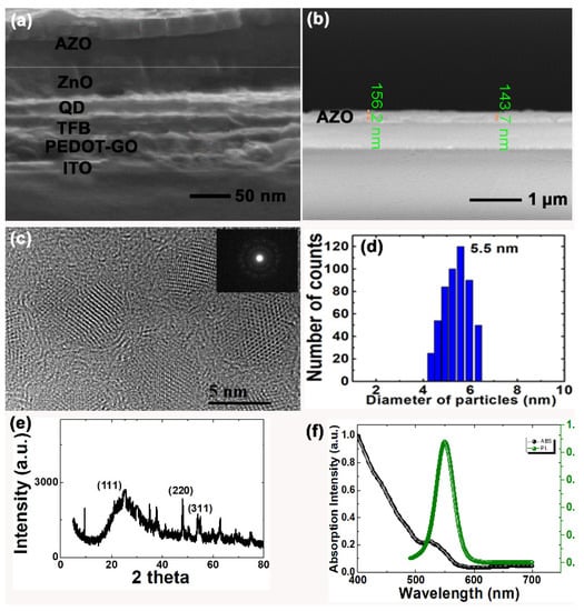 Cross-sectional SEM image of (a) QLED vertical structure and (b) AZO on glass; (c) HRTEM image and diffraction patterns of QDs; (d) size distribution; (e) XRD patterns; (f) absorption and PL spectra of QDs.