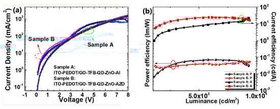 (a) The current density–voltage (J–V) and (b) brightness and power efficiency (ηA-L-ηp) of sample A and B under forward bias.