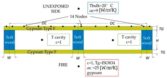 The numerical model considers the cross-section of the structure, considering perfect contact between the materials. The boundary conditions applied for (i) the exposed side and (ii) the unexposed side are those of Eurocode EN 1991-1-2 [14]. On the exposed side, radiation with a fire emissivity coefficient (ε) value of 1 and a convection coefficient (αc) of 25 W/m2K is considered, using the standard ISO 834 curve as the bulk temperature. On the unexposed side, the simplified version for the boundary condition includes the radiation effect, using only the convection coefficient αc = 9 W/m2K (Figure 1) [14]. An additional boundary condition is considered for the cavity region, considering only the radiation effect, performing the calculation of the cavity bulk temperature, and using the emissivity (ε) value of 1. The initial temperature of the LTF is constant and equal to T0 = 20 [°C] applied to all nodes of the model.