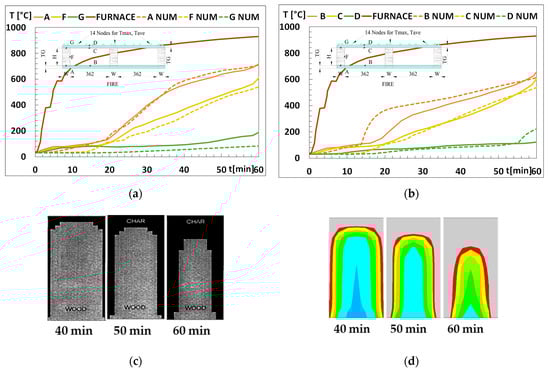 (a) Comparison of the temperature evolution at the stud’s points; (b) Comparison of the temperature evolution at gypsum plasterboards points; (c) Evolution of residual stud area [2]; (d) Evolution of residual stud area as numerical model used.
