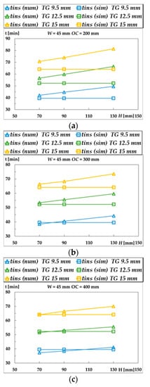 The parametric analysis is developed to verify the effect of the size of the studs (H), the distance between them (OC), and the thickness of the gypsum layer. The results of the 36 simulations (Table 1) include the fire resistance (Tave and Tmax), considering the insulation criterion (I) of selecting the shortest time (tins (num)) at which the unexposed side reaches an increase of ΔTave = 140 °C or ΔTmax = 180 °C [7] above the initial average temperature of the nodes (20 °C). This result is compared with the time determined by the separating function method (tins (sim)).