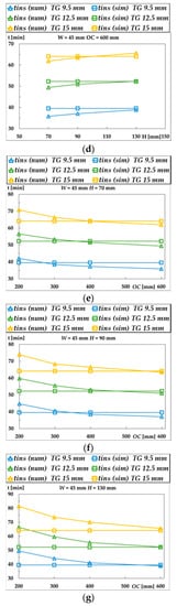 Comparison of wall fire-resistance time according to the simplified model (sim) and numerical (num) results: (a) OC as 200 mm; (b) OC as 300 mm; (c) OC as 400 mm; (d) OC as 600 mm; (e) H as 70 mm; (f) H as 90 mm; (g) H as 130 mm.