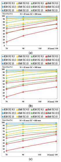 From Figure 4, it could be concluded that the residual area decreases with the distance between the studs. Therefore, the residual area is also affected by this geometry variation. By increasing the OC value from 200 to 600 mm, the residual stud area can vary from 0.7 to 41%, for the most unfavourable cases. In addition, according to Figure 4, it is also deduced that the residual area decreases with the depth of the stud, for any protection level (TG).