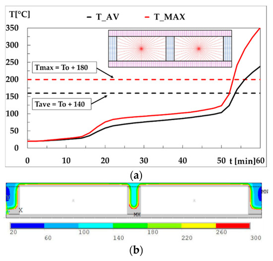 The finite element method is used to solve the nonlinear transient thermal analysis, considering the nonlinear behaviour of the thermal properties and an incremental solution process based on a variable time step (1 to 60 s). The nonlinear convergence criterion is based on the heat flow, considering a tolerance value of 0.001 and a reference value of 10−6 W. The 2D heat conduction inside the physical domain is mathematically modelled by the energy conservation equation (Equation (1)), where T represents the temperature [°C], ρ(T) is the specific mass [kg/m3], Cp(T) is the specific heat [J/kgK], λ(T) is the thermal conductivity [W/mK], t is the time [s] and ∇ = (∂x, ∂y) is the gradient. Equation (1) is based on the heat-flow balance for the infinitesimal material volume in each spatial direction.