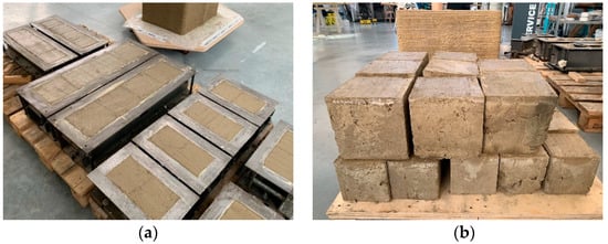 After the removal of the formworks (Figure 2b), curing took place under controlled conditions of temperature and humidity in the curing chamber. In particular, as there are still no specific regulations on the preparation of specimens made with earthen mixtures, we followed the indications of temperature and humidity provided by UNI EN 12390-2: 2009 for the curing of the mortar and concrete specimens: a controlled temperature of 20 ± 0.5 °C, and a relative humidity ≥95%.
