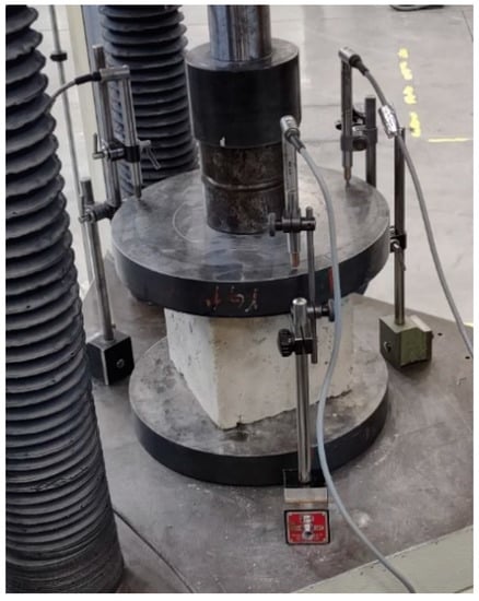 In order to reduce the effect of the geometric imperfections on the experimental data, we acquired the vertical displacements of the upper faces of the specimens with three LVDTs (linear variable differential transformers) produced by Gefran SPA (Brescia, Italy), positioned radially at 120° on the bottom plate of the testing machine (Figure 4). The vertical displacement is then the average value acquired by the three LVDTs.