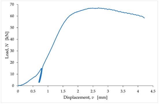 In order to favor the coupling between the specimen and the testing machine, it is possible to carry out some stabilization cycles [113], which consist of repeated unloading–reloading cycles performed for a fraction of the presumed maximum load (Figure 6). The effect of the stabilization cycles is to shorten the coupling phase, which means that the adaptation phenomena cease for a lower value of the applied load. If the stabilization process is successful, the slope of the load/displacement curve at the end of the last stabilization cycle is equal to the slope that the load/displacement curve would have shown in the absence of stabilization, at the end of the coupling phenomena. It is worth noting that the minimum load value in an unloading–reloading cycle is always greater than zero, as the total removal of the load would cause a loss of contact between the testing machine and the specimen. The choice of the load value at which to start the unloading–reloading cycles is also up to the operator and strongly depends on his experience. This value varies between approximately 10% and 20% of the presumed maximum load.