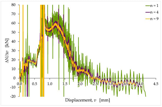 Because of the small quantities involved in Equation (2), and the oscillatory nature of the acquired curve, the manual identification procedure results in oscillatory slope values. It is possible to reduce the fluctuations of by increasing the value of (Figure 7). In any case, the optimal value of depends on the individual test. Therefore, it requires an accurate evaluation by the investigator.