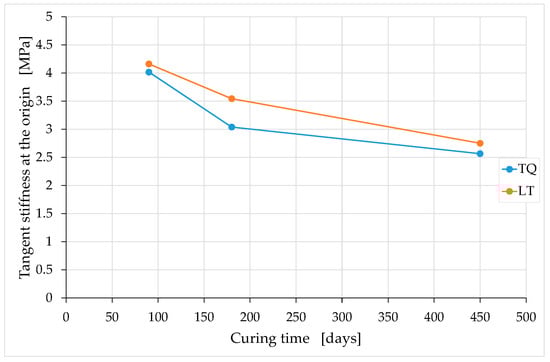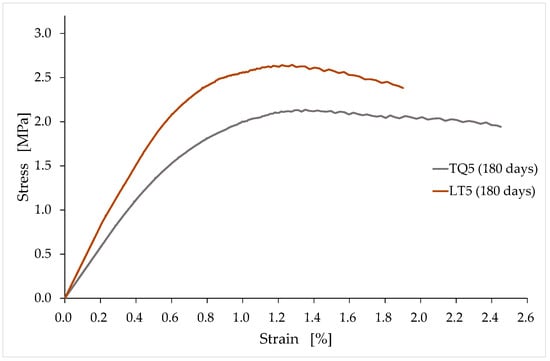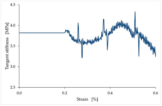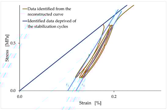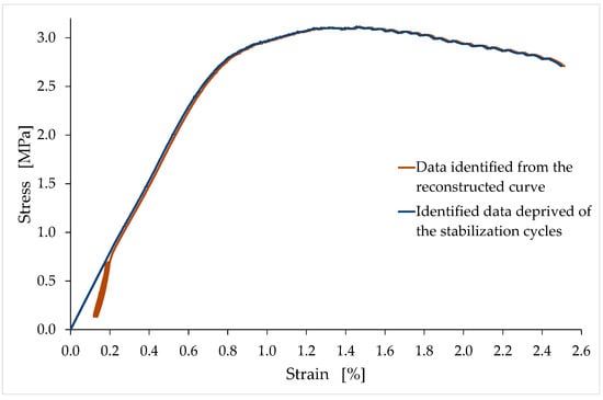 After the reconstruction of the first linear branch, the procedure for identifying the stress/strain curves proceeds with the elimination of the stabilization cycles (and, consequently, of the accumulated strain) to provide monotonic nondecreasing curves up to the maximum stress (see Figure 9 for the LT6 specimen). The connection point in this second phase of the reconstruction procedure is the final point of the last unloading–reloading cycle. The slope of the reconstructed branch in the stress/strain curve provides the tangent modulus at the origin.