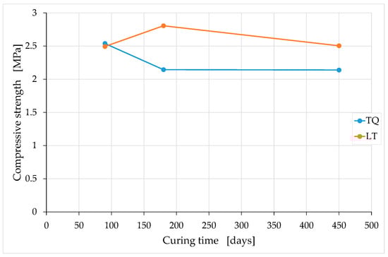We subjected the eighteen specimens of the experimental program—nine for each mixture (Table 3)—to uniaxial compression tests in groups of three, at 90, 180, and 450 days of curing (the casting of all specimens took place on the same day). Section 4 will show the results of the uniaxial compression tests, averaged over the three different curing periods.