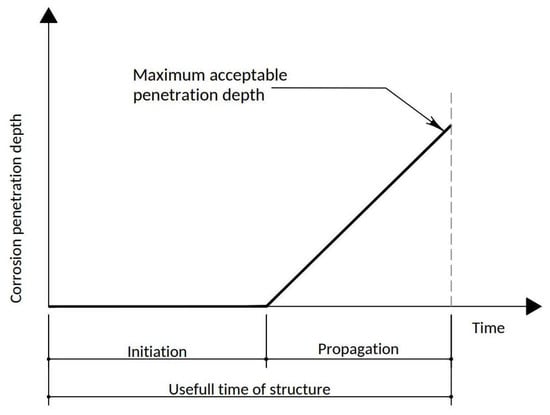Initiation and propagation periods for corrosion in a reinforced concrete structure (Tuutti model) [].
