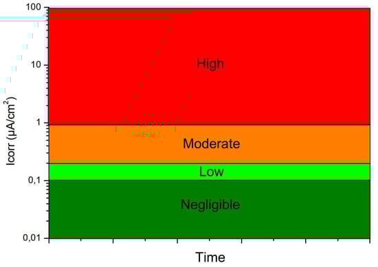 The corrosion rate of steel is normally expressed as the rate of penetration of generalized corrosion (thickness of the steel reinforcement that is converted to oxide per unit of time) and is measured in μm/year. Often, especially in laboratory tests, it is expressed in electrochemical units as mA/m2 or μA/cm2. In the case of steel, 1 mA/m2 or 0.1 μA/cm2 corresponds to a mass loss of approximately 90 g/m2/year and a penetration rate of approximately 11.7 μm/year. The corrosion rate can be considered negligible if it is below 0.1 μA/cm2, low if it is between 0.1 and 0.2 μA/cm2, moderate between 0.2 and 1 μA/cm2 and high if it is between 1 and 100 μA/cm2 according to the RILEM (International Union of Laboratories and Experts in Construction Materials, Systems and Structures) (Figure 2).