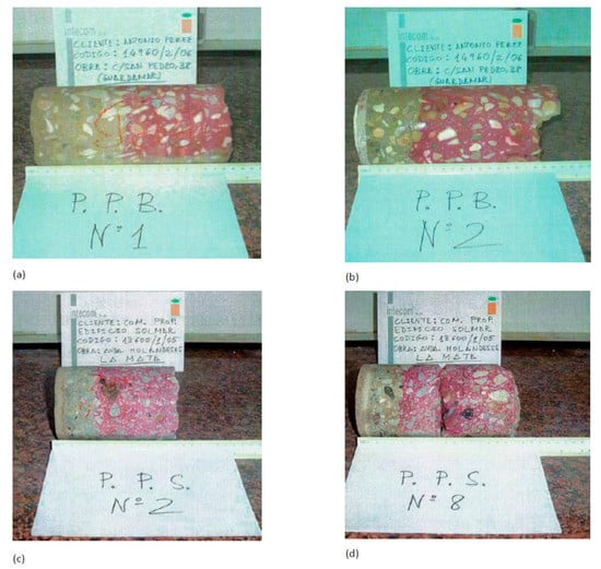 Prior to studying the different projects and as a necessary methodology for decision-making in the drafting of the execution projects, in all cases, the compressive strength and carbonation depth tests of the concrete element analyzed were carried out (two pillars in seven buildings and one pillar in three buildings, making a total of seventeen pillars) by approved quality control laboratories. All the studies were performed on the ground floor or basement pillars and in non-aggressive and normal environments, which are defined in Table 8.2.2. of EHE-08 []: General exposure classes related to rebar corrosion.