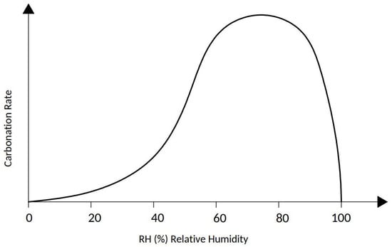 Schematic representation of the carbonation rate of concrete as a function of the relative humidity of the medium, under equilibrium conditions [].