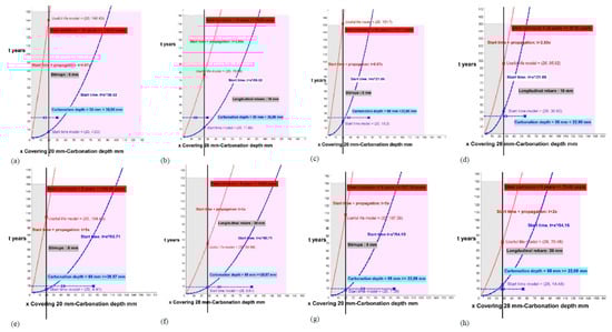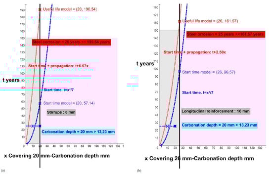 The data obtained from the experimental phase in the laboratory and from the in situ tests, together with the coefficients in the application of the standard, offer the corresponding model of t = x/K for each element (Table 3) []. In this way, it is possible to know the period of initiation of corrosion of each element or pillar analyzed at a certain point in its useful life.