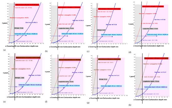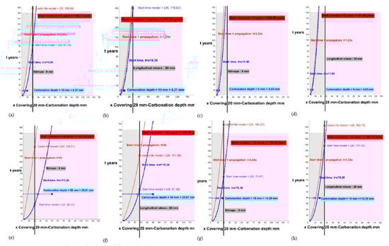 Start and propagation corrosion times in building 8A, 9M and 10E. (a) 8A_P1_ Stirrups. (b) 8A_P1_ longitudinal rebars. (c) 8A_P21_ Stirrups. (d) 8A_P21_longitudinal rebars. (e) 9M_P1_ Stirrups. (f) 9M_P1_ longitudinal rebars. (g) 10E_P11_Stirrups. (h) 10E_P11_longitudinal rebars.