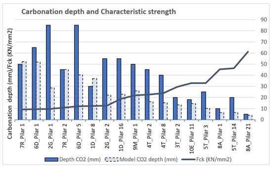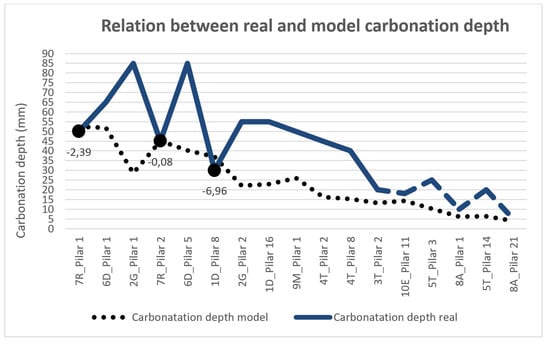 Figure 12 is a comparison of the real results and the figures derived from the model, and we can observe that in three cases, namely 7R_Pillar 1, 7R_Pillar 2 and 1D_Pillar 8, the real carbonation is less than or equal to the model’s figures, with values of 2.39, 0.08 and 6.96 mm, respectively, which is less than expected (points indicated in Figure 9). These are pillars with low f and ages of approximately 24 years. In all the other cases, the carbonation depth of the concrete is greater than the estimated value.
