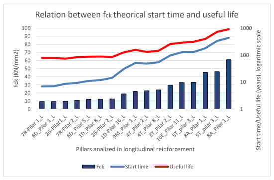 The data are presented in order from lowest to highest characteristic strength (Figure 13). The results of the theoretical models of the corrosion initiation periods express a clear tendency toward longer carbonation times of the coating for higher f, which is in accordance with the mathematical expressions contemplated by the regulations. The same happens with the periods of propagation of corrosion and, therefore, with the theoretical useful life (sum of beginning and propagation), which increases considerably with the characteristic resistance of the concrete of the element.