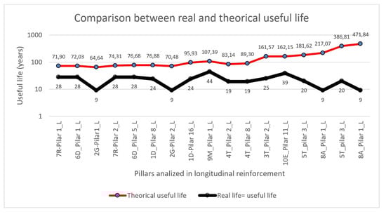 In Figure 14, following the same order of presentation for the results (according to f from lowest to highest), the results of the useful life model and the real life of the element are shown, and it is clear that the real useful life (between 9 and 44 years) is much lower than that expected (from 71 to 471 years).