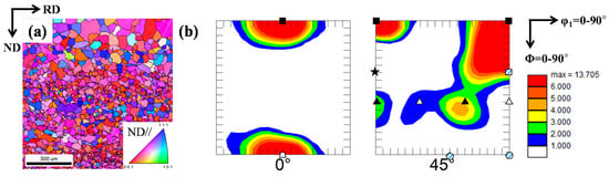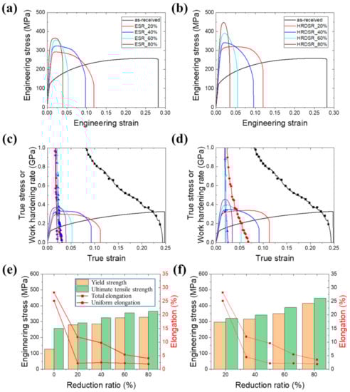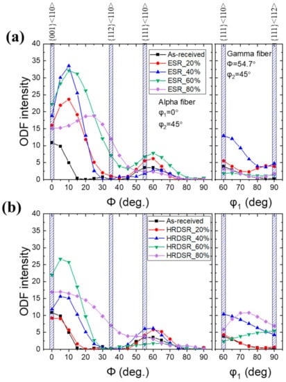 - The ESR-processed samples exhibited a stronger α-fiber than the HRDSR-processed samples, while the HRDSR-processed samples exhibited a stronger γ-fiber, indicating that strong shear deformation induced by HRDSR promoted the development of γ-fiber.