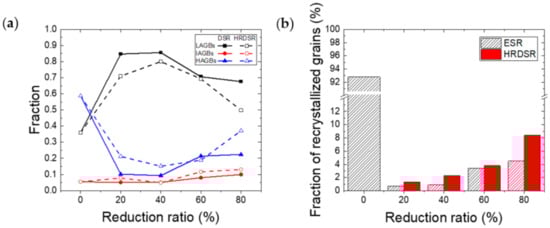 - More effective grain refinement by CDRX occurred in the samples processed by HRDSR compared to those processed by ESR, but the degree of grain refinement was low even in the HRDSR-processed samples most likely due to a very high SFE of Nb.